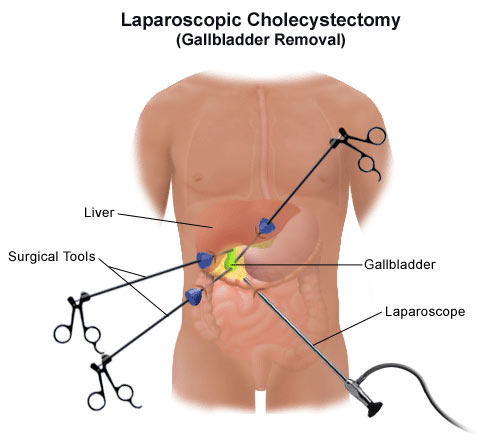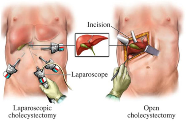 Laparoscopic cholecystectomy. This is the more common procedure. The surgeon passes instruments, a light, and a camera through several small cuts in the belly. He views the inside of the body on a video monitor. You usually go home the same day.