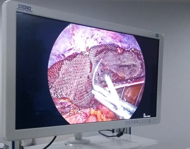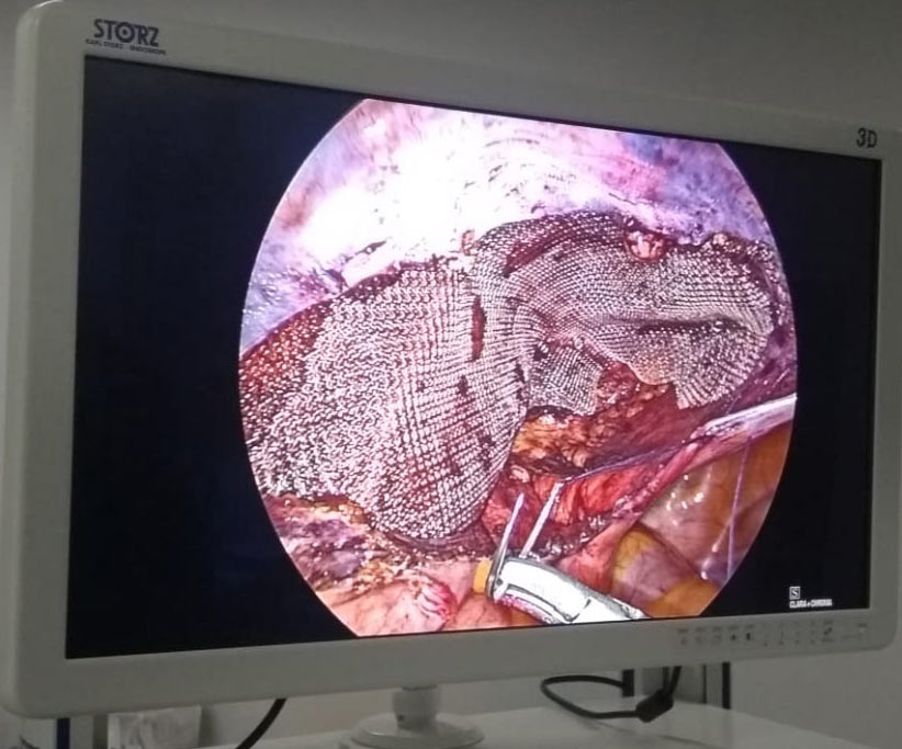 A laparoscope is inserted into one incision. Guided by the camera, the surgeon inserts tiny instruments through other incisions to repair the hernia using synthetic mesh.